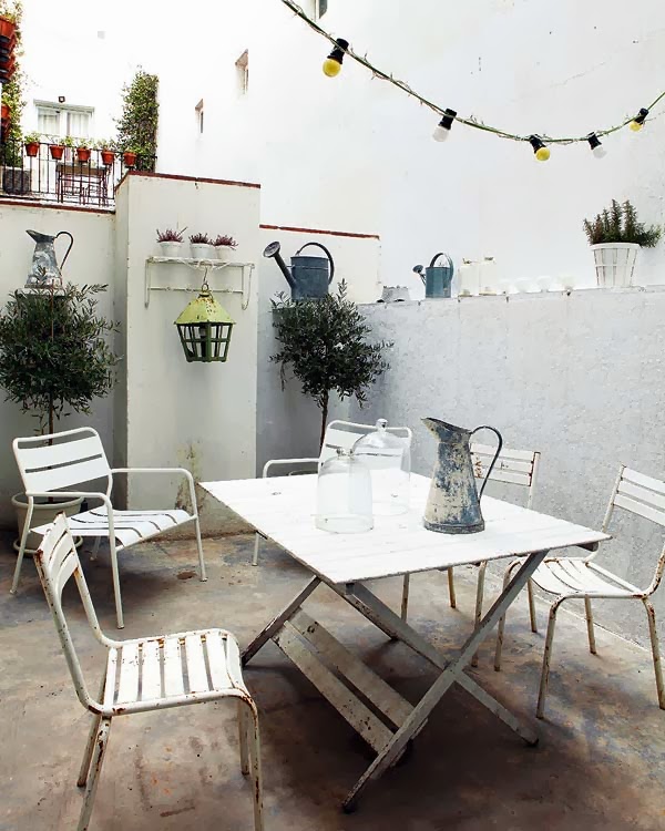 10、这是一个露天的阳台,这里同样是破旧的家具和斑驳的水泥地面,尤其是桌上摆放的掉漆的水壶,和室内的欧式风格非常的统一协调;这里可以让疲惫的心暂时停下来放松。