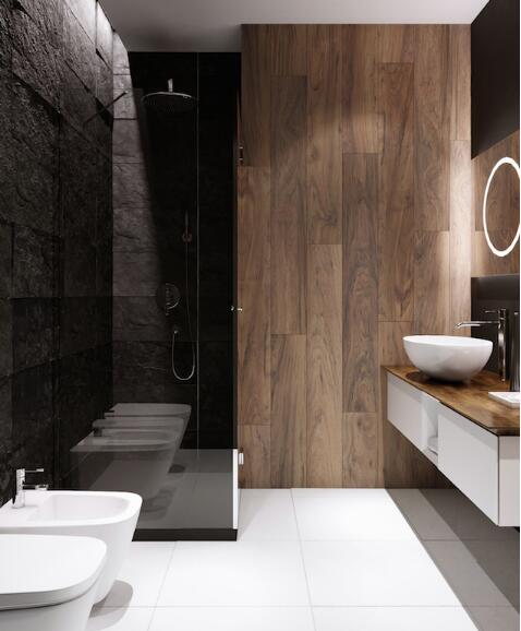 08、卫生间黑色白色的经典搭配,融合实木材质装饰,黑色的玻璃隔出淋浴间,深藏不露的奢华让人无法忽视,墙面圆形的镜面有灯带装饰,看起来时尚别致,你也可以这样设计卫生间。