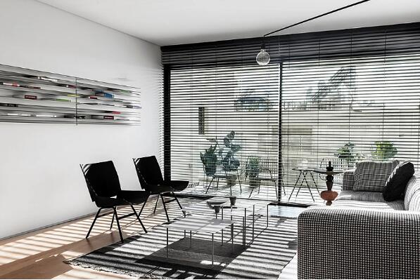 02、客厅空间黑色的百叶窗非常的抢眼,让空间顿时显得层次分明,灰色的长沙发搭配黑色的现代座椅,带有渐变色调的地毯有效呼应了百叶窗和整体的空间色调。在顶部沿着墙边做了一周黑色的色带装饰,这样不会太单调乏味。