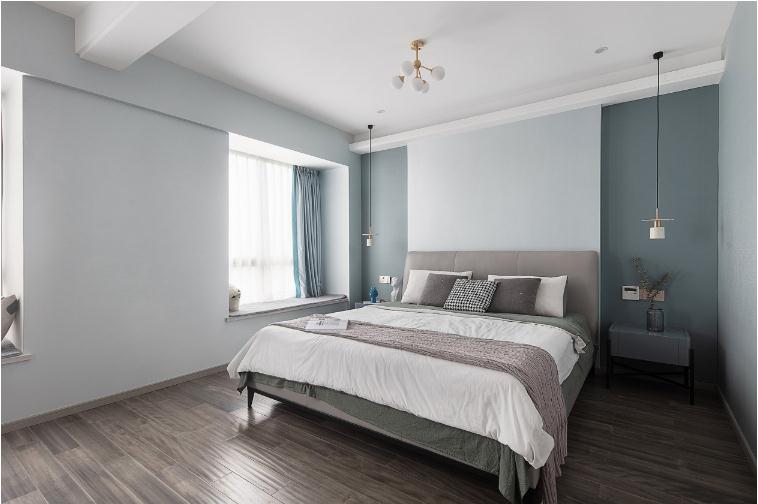 06、主卧室简约清爽,灰色的背景墙搭配精致的床头吊灯让人非常的享受休闲的时光;舒适的飘窗是另一个沉思的地方,可以欣赏室外的风景,放松疲惫的心情。