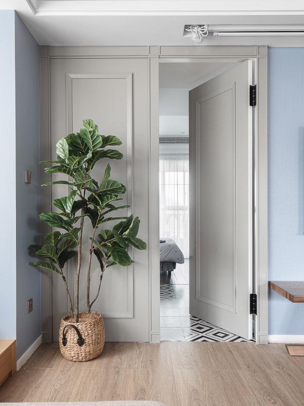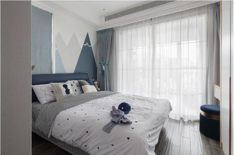 09、儿童房选择冰川灰和蓝色营造清新安静的空间氛围,衣柜临窗的地方设计了一个书桌,整个空间非常适合睡眠和学习。床头贴合孩子的特性设计了一个充满想象的背景墙,简单的玩偶和卡通图案的布艺床品既不会让空间显得沉闷,也不会让空间太过跳跃感。