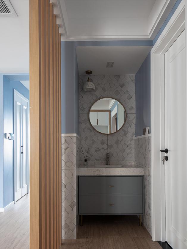 11、玄关空间选择了实木栅格做分割,让玄关和客厅空间形成一个缓冲;这里墙角的凹陷处充分利用起来设计了洗手池,带有花纹的墙砖和圆镜让这里显得活泼又有格调。