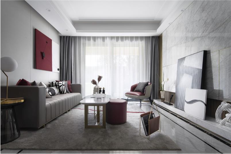 01、客厅沙发背景墙巨幅的红色装饰画是不是非常的抢眼,在灰色的空间背景墙没有觉得特别突兀,反而有种强烈的对比感受,搭配金色细边的家具,现代轻奢的氛围加上时尚的个性化油然而生。利用大理石硬朗的质感塑造空间的干练利落,电视背景墙的加入...