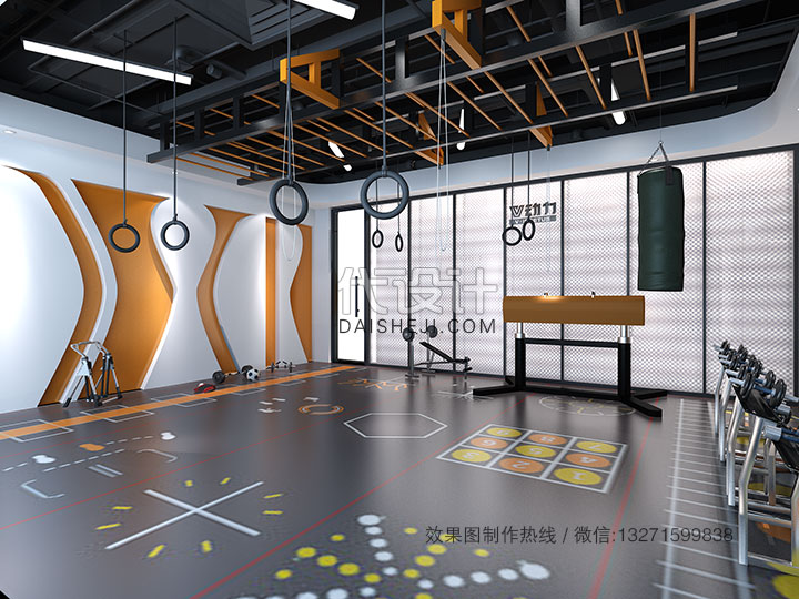 橙黄色在空间顶面、墙面和地面都做了恰当的呼应-健身房效果图