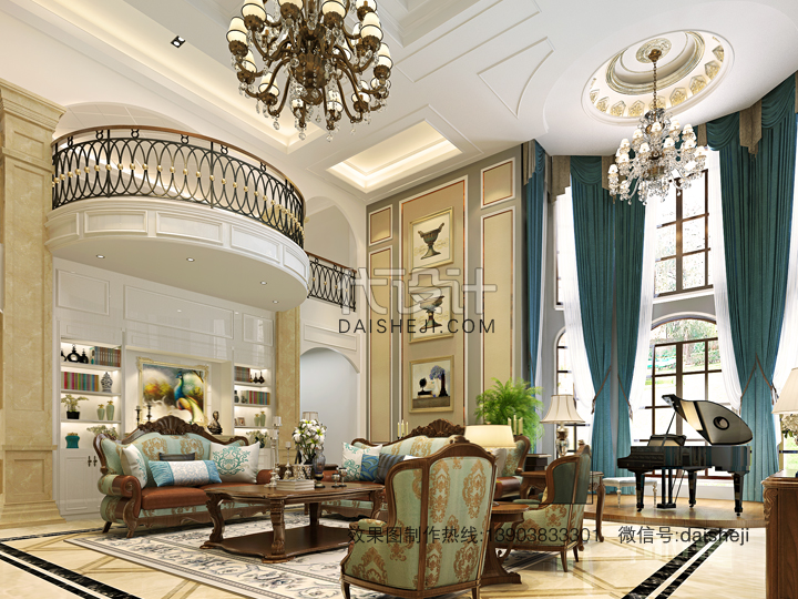 明亮大气美式挑高客厅效果图设计制作